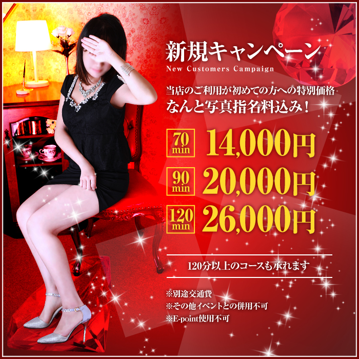 新人お姉さん割※NEWマークがついているお姉さんが対象です指名料無料新人お姉さんに関しましてはお気軽にお問い合わせください。※本指名様も適用ですよ※新人期間中は指名料無料です※E-ポイントは3000PTまで併用可能