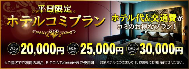 ホテルコミプランホテル代と交通費がコミのお得なプラン!70分コミコミ ¥20,00090分コミコミ ¥25,000120分コミコミ ¥30,000※指名でご利用の際はE-POINTご指名料分まで使用可ホテルコミプラン対象のホテルにつきましては、